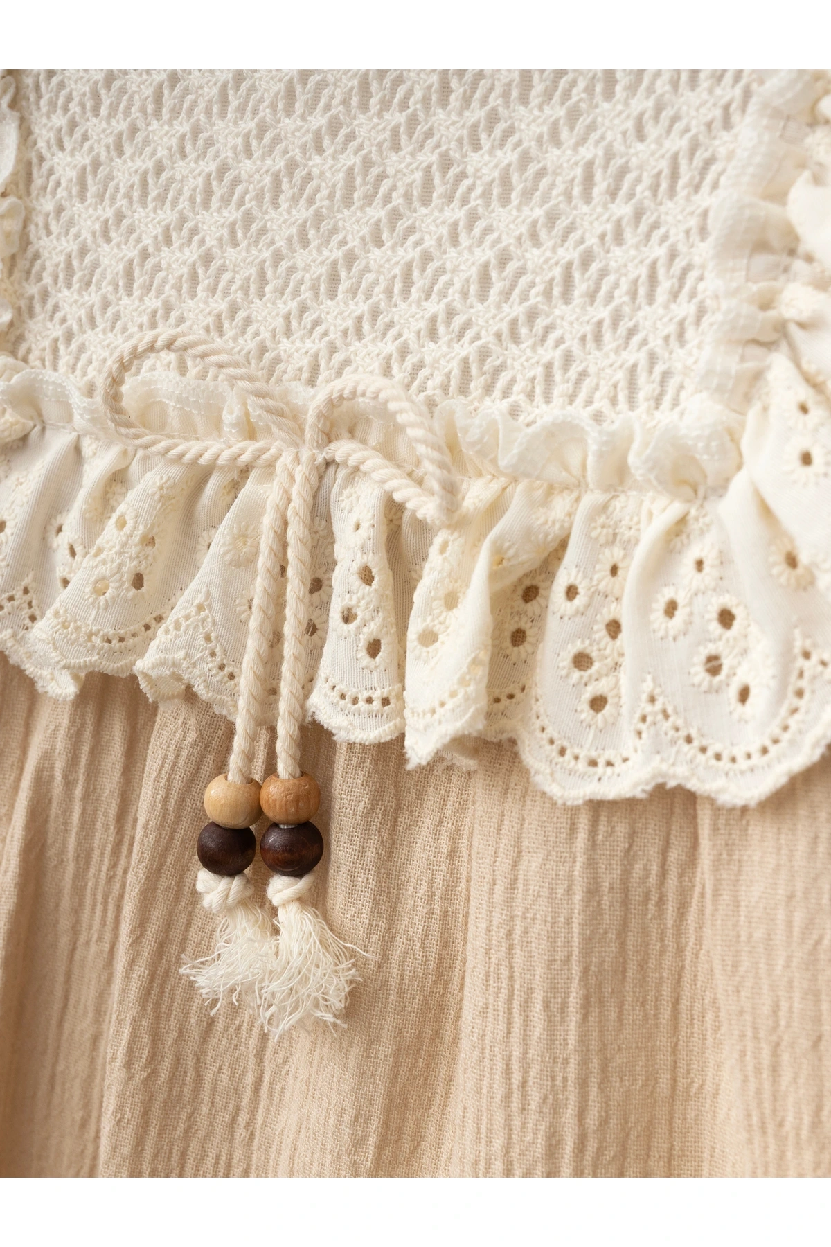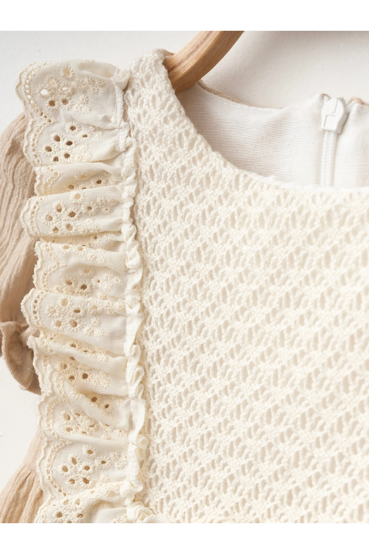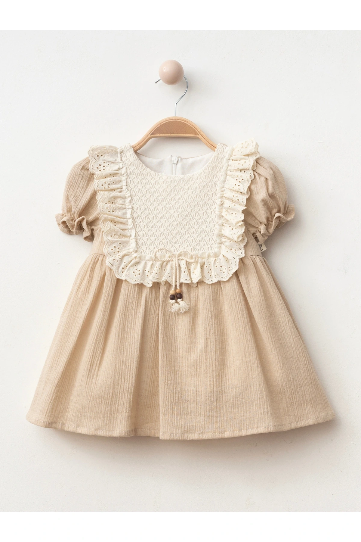 - İç göstermeyen yapısı ile bebeğinizin rahatlığını ön planda tutar.; - Fermuarlı kapama özelliği sayesinde kolayca giydirilip çıkarılabilir.; - Orta kalınlıkta kumaşı, yaz ayları için ideal konfor sağlar.; - Party koleksiyonuna özel tasarlanmış jile siluetiyle şıklığı ve rahatlığı bir arada sunar.; - Dantel detayları ile zarif bir görünüm kazandırırken, cepsiz tasarım pratik kullanım imkanı tanır.; - Astarlı yapısı sayesinde bebeğinizin cildini korurken, kemersiz tasarımıyla modern bir dokunuş ekler.; - Kısa balon kolları ve bebe yakası ile mevsim geçişlerinde de tercih edebileceğiniz çok yönlü bir seçenektir.; - Dokuma kumaşı dayanıklılığı arttırarak uzun süreli kullanım vaat eder.; - Regular boy kesimiyle her bedene uyum sağlayacak şekilde dizayn edilmiştir.; - Türkiye menşeli olmasıyla yerel üretim avantajını yansıtır.; - Dokuma materyali sayesinde nefes alabilir yapıda olup, bebeğinizin gün boyu rahat etmesini sağlar.; - Party ortamları için ideal olan bu elbise, özel günlerdeki şıklığınızı tamamlar.; - Sade düz deseniyle zamansız bir tarz sunarken, balon kol detaylarıyla dikkat çeker.