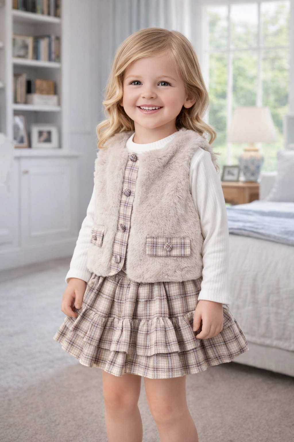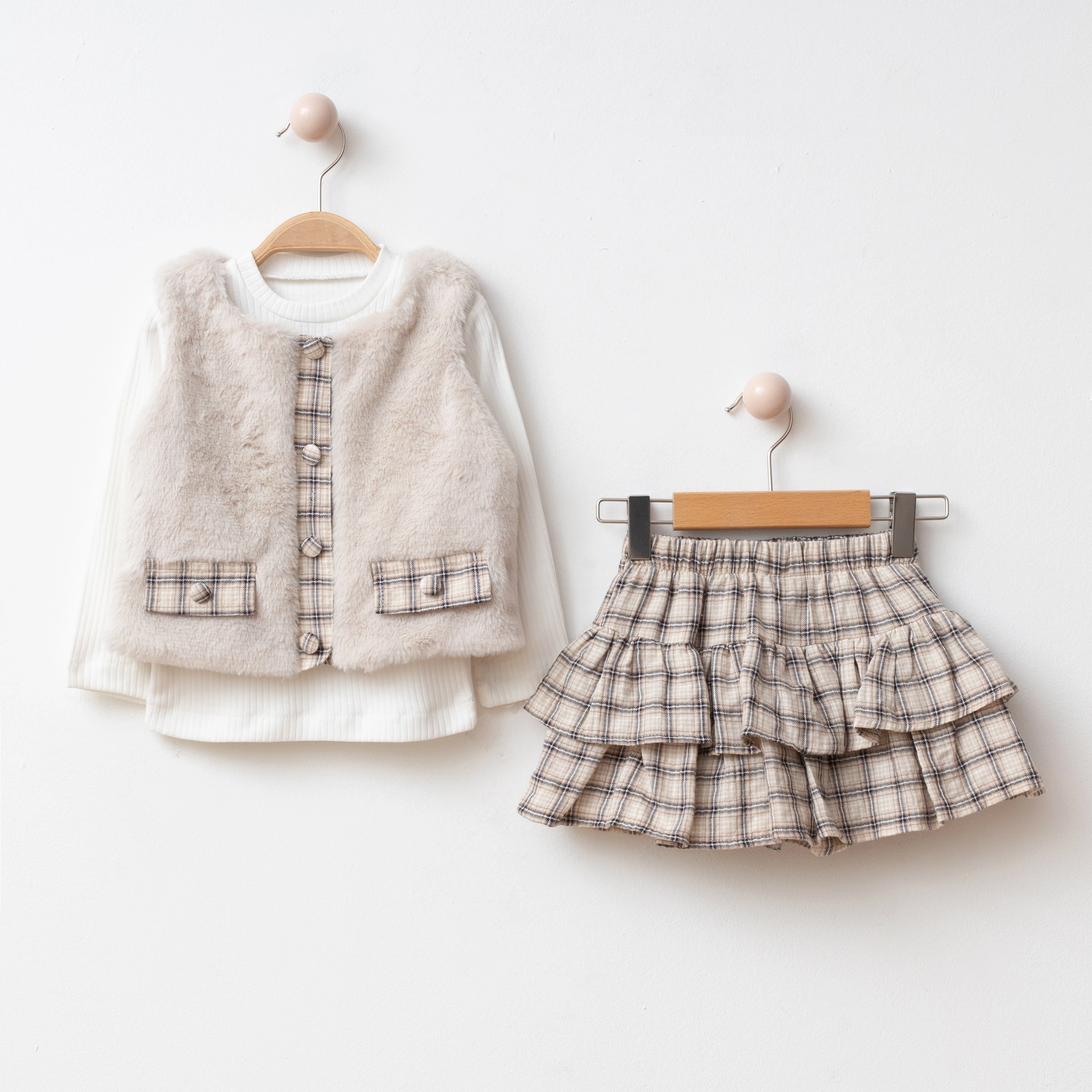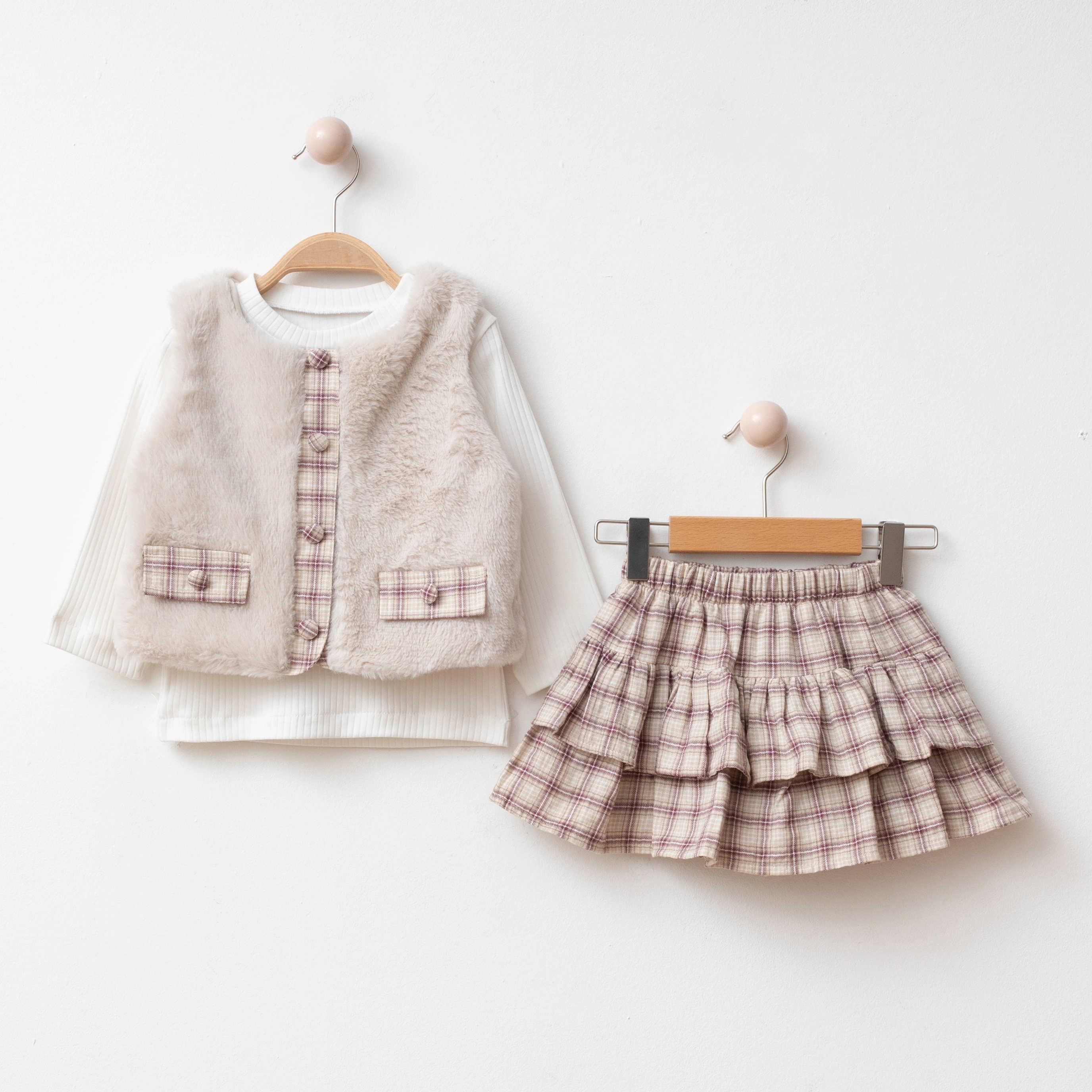 Elisa Kız Çocuk Ekose Etekli Peluş Yelek Takım, şıklığı ve konforu bir araya getiren özel bir tasarımdır.
