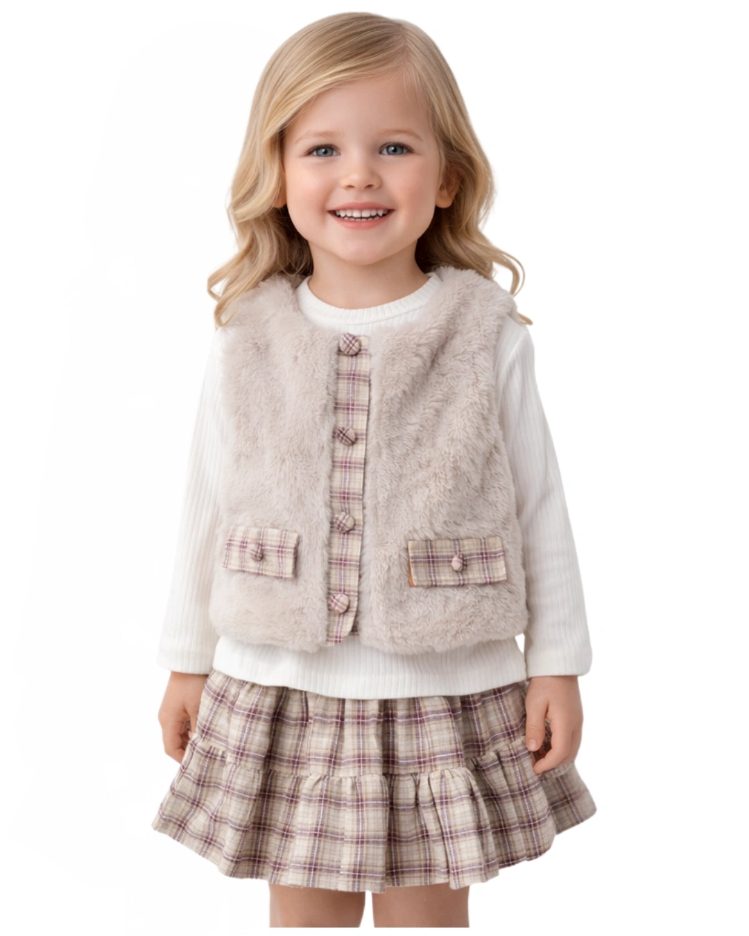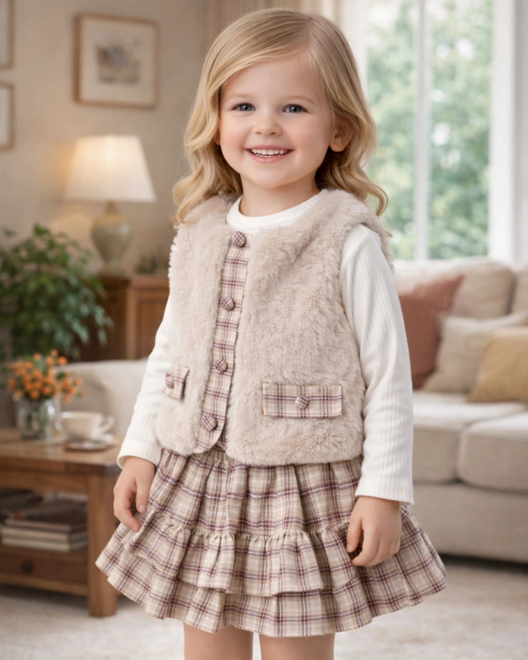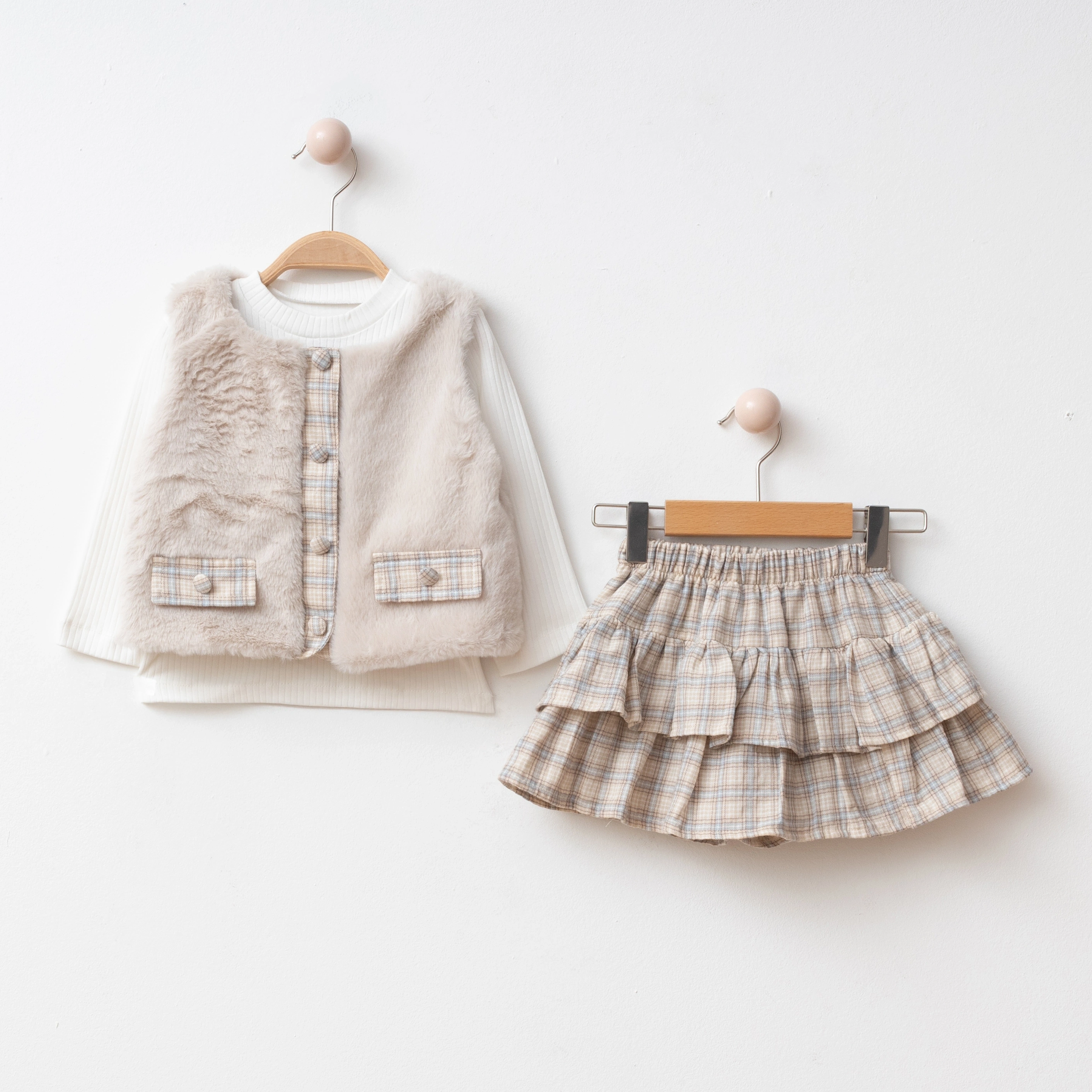 Elisa Kız Çocuk Ekose Etekli Peluş Yelek Takım, şıklığı ve konforu bir araya getiren özel bir tasarımdır.
