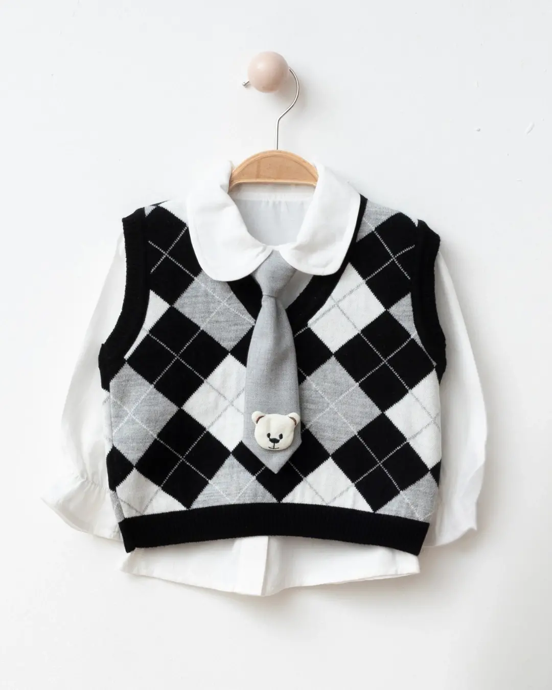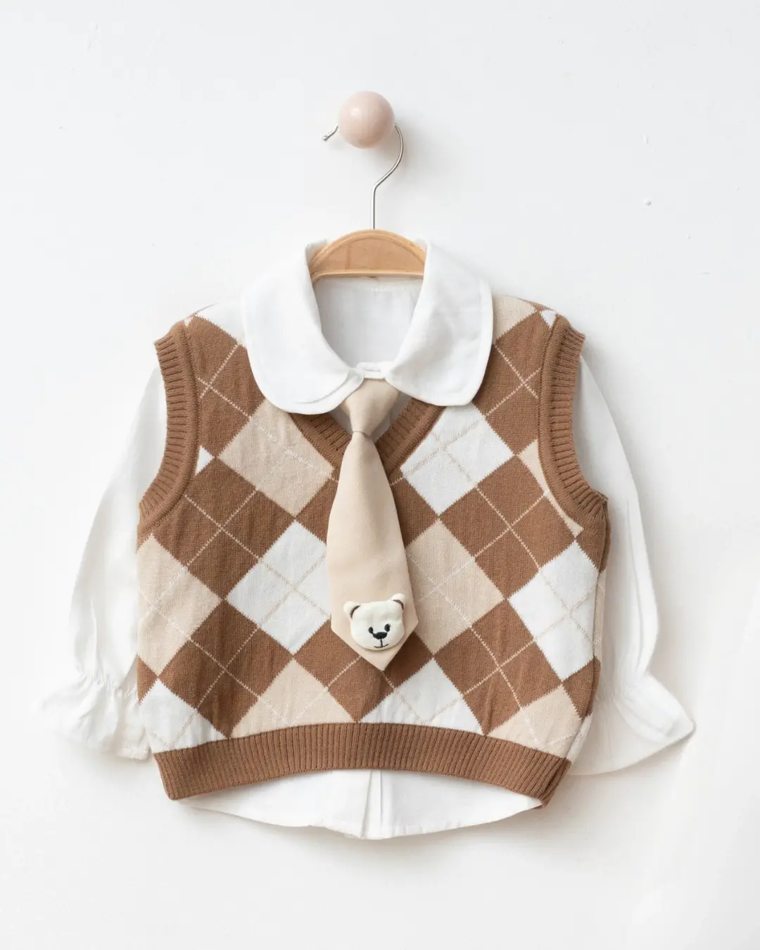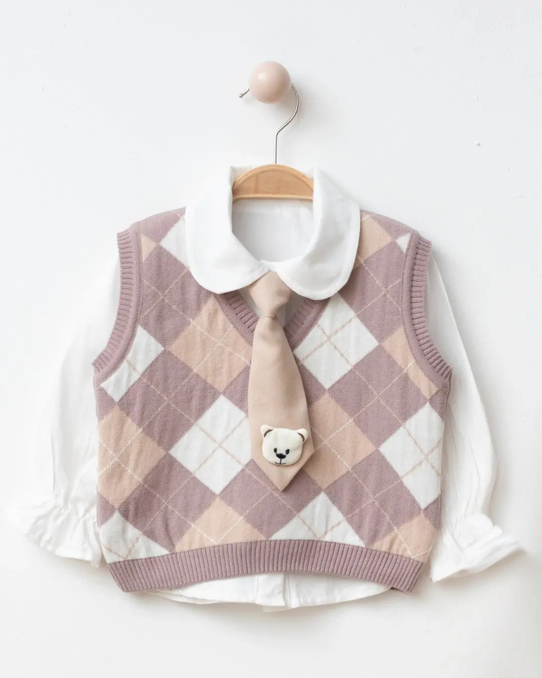 Zarif detayları ve zamansız baklava deseniyle öne çıkan çocuk triko yelek, miniklerin kombinlerine şıklık katmak için tasarlandı. Yumuşak dokulu triko kumaşı sayesinde gün boyu konfor sağlarken, klasik görünümüyle hem günlük hem özel gün kombinlerine kolayca uyum sağlar.
