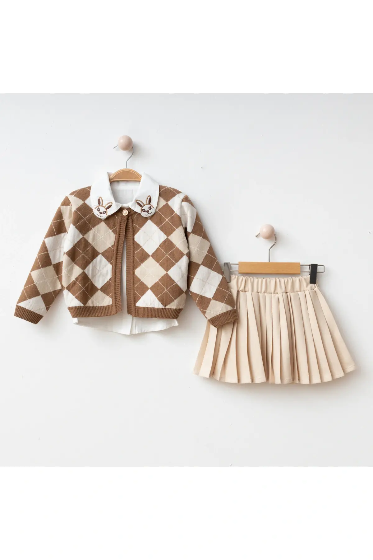 - Kış aylarında sıcak tutan kalın dokuma tipi triko kumaştan üretilmiştir.; - Casual ve günlük kullanım için ideal, rahat kesimiyle çocukların hareket özgürlüğünü kısıtlamaz.; - Ceket-etek takımı olarak sunulan bu set, hem şıklığı hem de fonksiyonelliği bir arada sunar.; - Geniş paça tasarımı ile konforlu bir kullanım sağlar ve pileli siluetiyle modern bir görünüm kazandırır.; - Mono kapama şekli sayesinde kolayca giyilip çıkartılabilir ve pratik kullanım sunar.; - Mix nakış detaylarıyla zenginleştirilmiş peluş dokunuşlar, ürüne ekstra bir şıklık katarken çocukların ilgisini çeker.; - Gömlek yaka tasarımı ile klasik ve zamansız bir stil oluştururken kemersiz tasarımı sayesinde rahat hareket etme imkanı tanır.; - Astarlı yapısı ile soğuk havalarda ekstra koruma sağlar ve iç sıcaklığın korunmasına yardımcı olur.; - TR menşei garantisiyle Türk kalitesi ve işçiliğini yansıtır.;