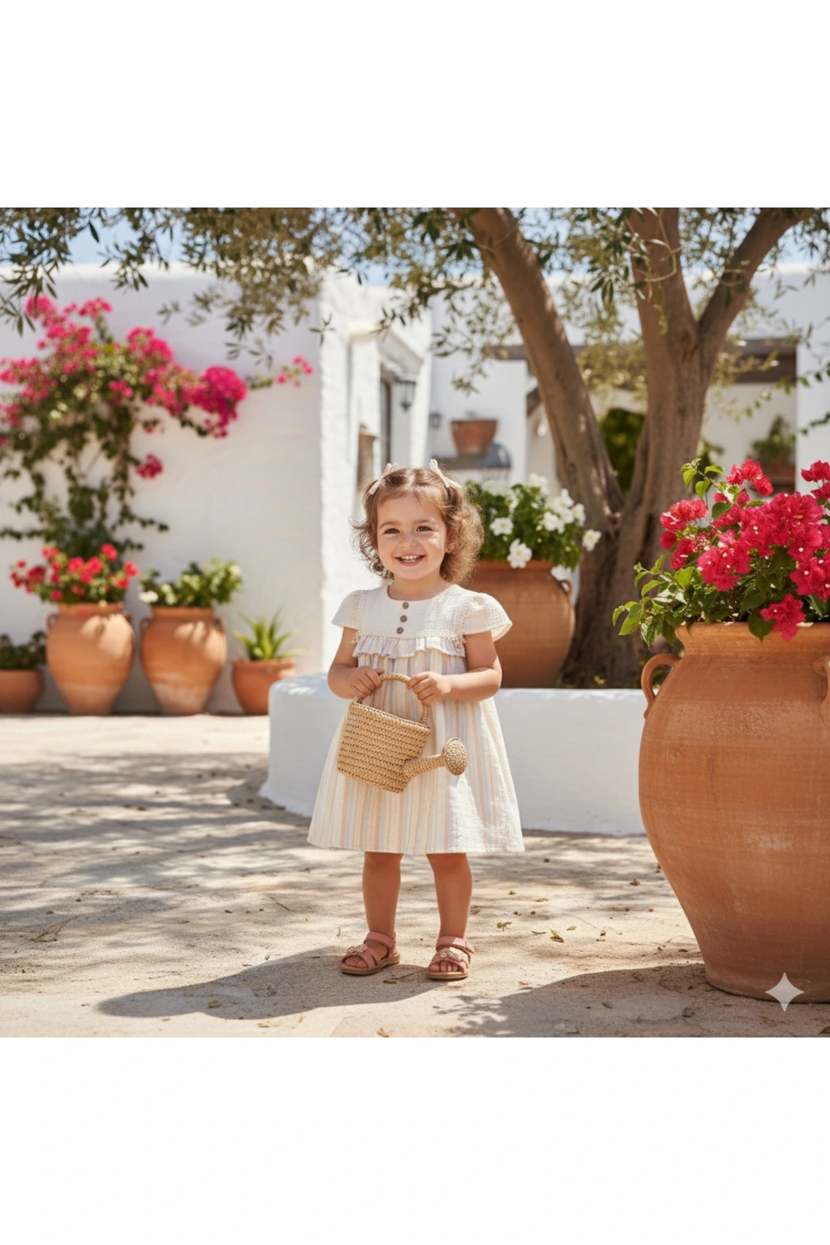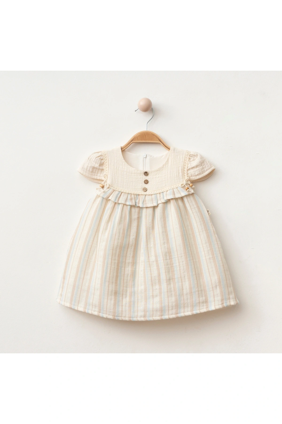 Safiye Kız Bebek Çizgili Fırfırlı Elbise, sade zarafetiyle dikkat çeken nostaljik bir modeldir. Yumuşak pamuk dokulu muslin kumaşı, ince pastel çizgileri ve fırfırlı göğüs detayıyla hem şık hem konforludur. Ahşap düğme görünümlü ön detaylar, dantel kenar süslemeleri ve doğal tonlarıyla vintage havasını tamamlar.